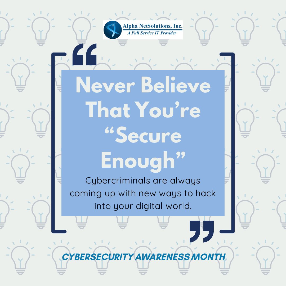 Day 22 of Cybersecurity Awareness Month- our tip for today? Never believe that you're "secure enough". Cybersecurity is a constantly changing field, as hackers develop new ways to threaten your data. Stay in it for the long haul! https://t.co/3fwUCI3b9l