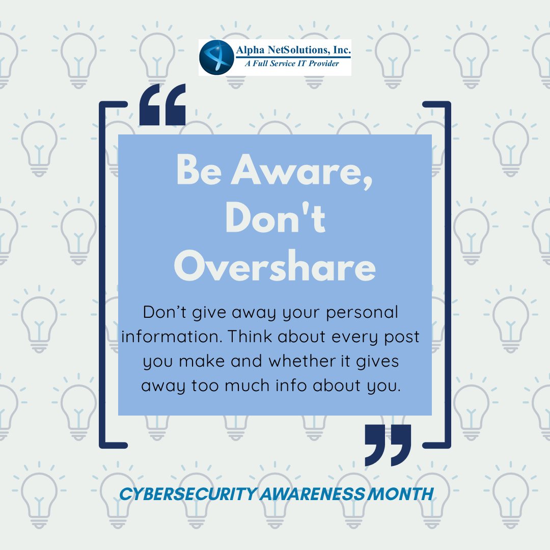Day 9 of Cybersecurity Awareness Month! Today's tip: be aware, don't overshare! Always think about who's able to see every post you make online and whether it's safe for them to have access to that information or not. https://t.co/FIMYfMO1Qu