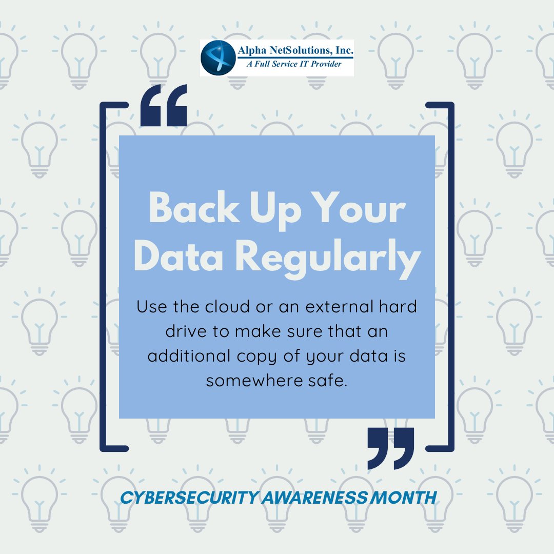 Our next tip for Cybersecurity Awareness Month is to back up your data regularly! Whether it's on the cloud or a physical storage device, everyone should be keeping some form of backup for their most important files. https://t.co/DmWPmSRIhC