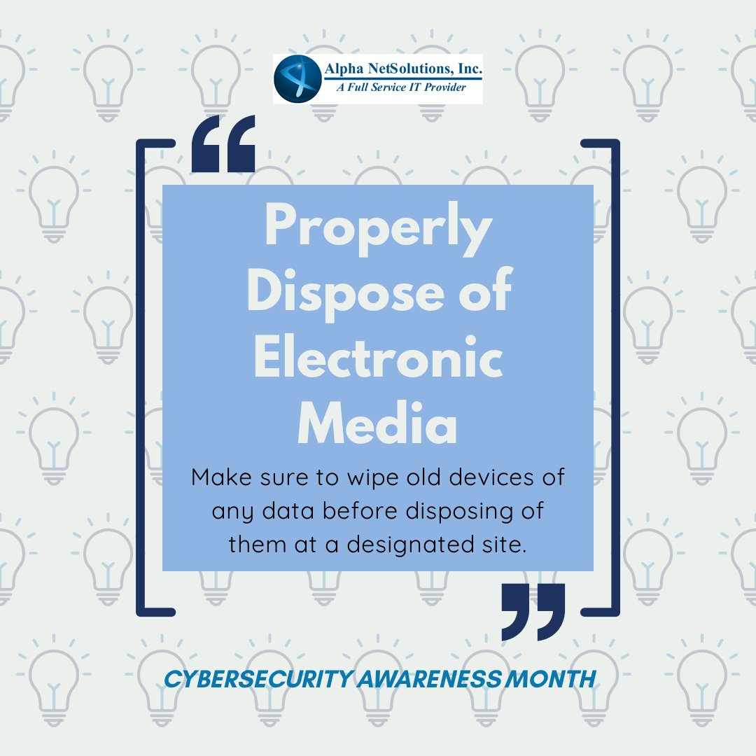 Properly dispose of electronic media- our next tip for Cybersecurity Awareness Month! Whether it's an old storage device or even an entire computer, always be sure to thoroughly delete all files from a device before taking it for disposal. https://t.co/RquXrUUXPO