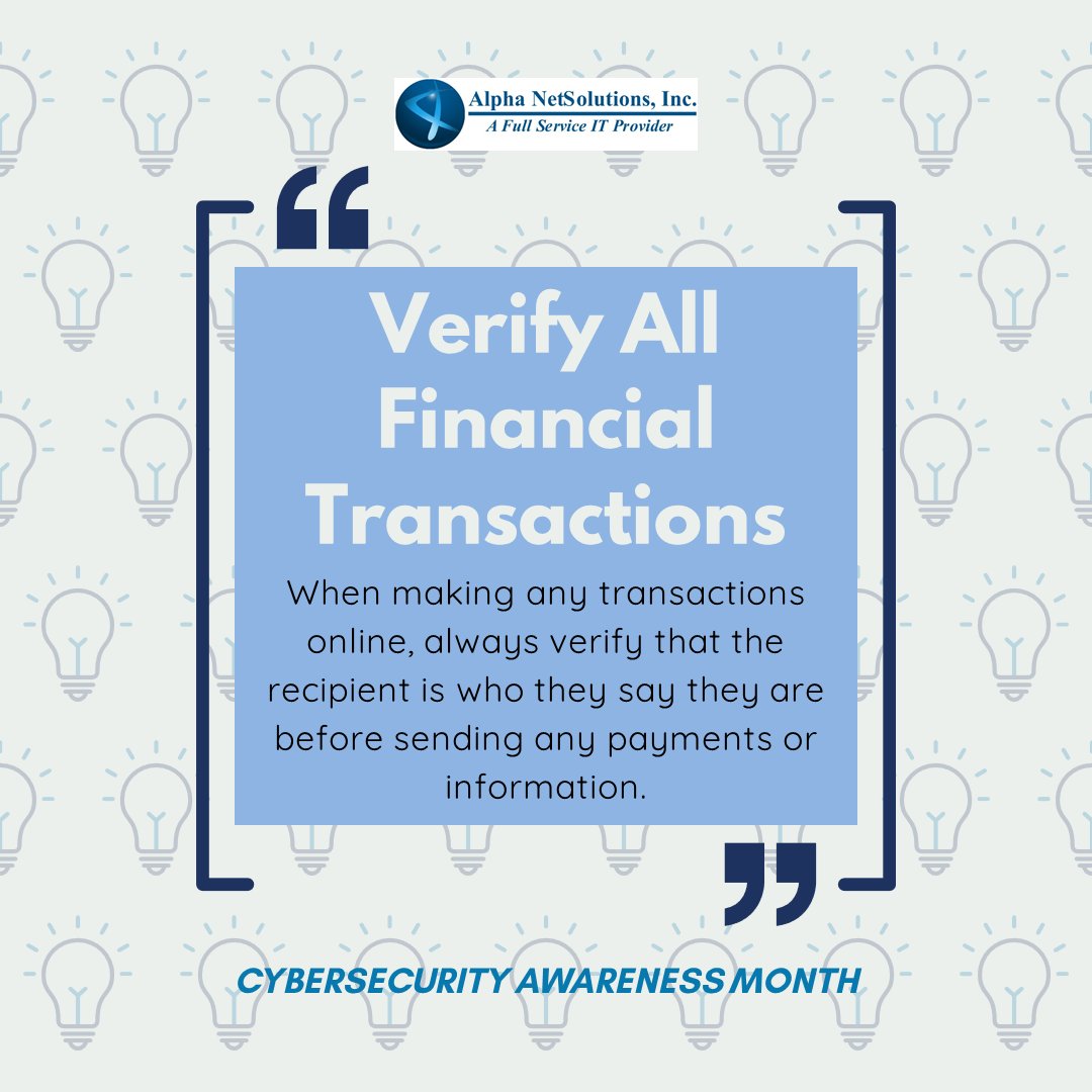 The next tip we have for Cybersecurity Awareness Month is to verify all financial transactions. If you are making any kind of financial transaction online, always take extra precautions to make sure you know who you're really talking to. https://t.co/9JMdMHF29i