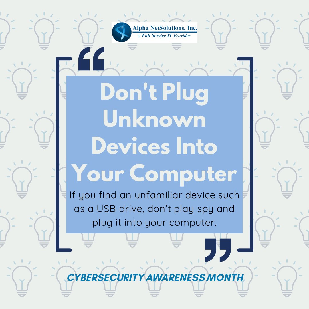 This next tip for Cybersecurity Awareness Month is simple, but important- don't plug unknown devices into your computer! It can be tempting to investigate a strange USB drive you find lying around, but your curiosity might just get your machine infected with malware! https://t.co/UnsCeqVCVw