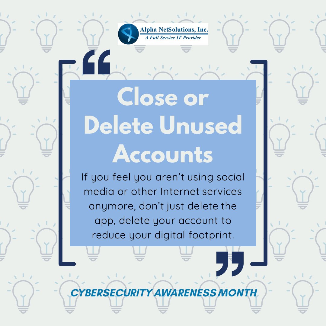 This Sunday's tip for Cybersecurity Awareness Month: close or delete unused accounts. If you have an account lying around on a website or app you don't use anymore, getting rid of it can help stop cybercriminals from getting more information out of you. https://t.co/uwCpjnVMb1